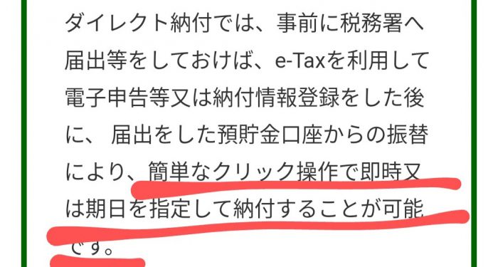 だってね、確定申告の最後にe-taxで「ダイレクト納付」という方法を選択したんです。