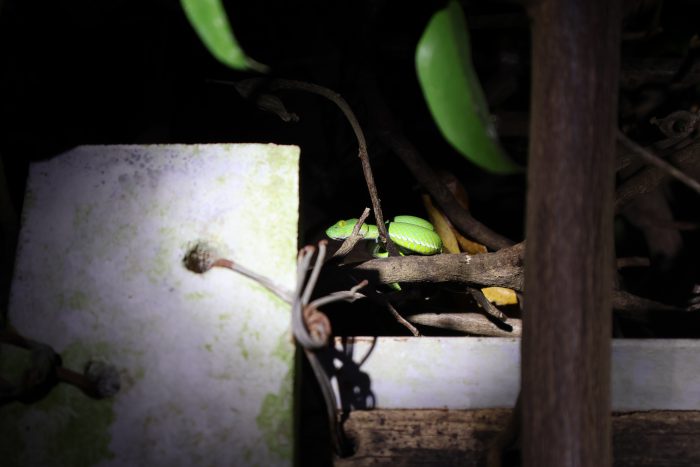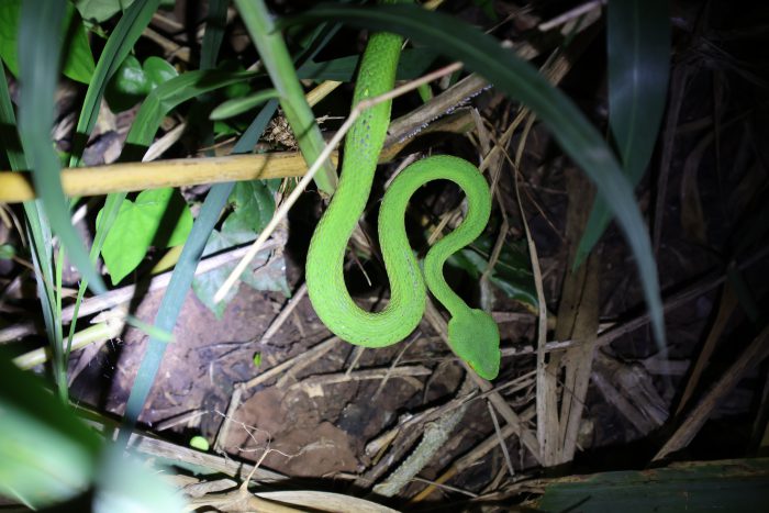 今度は道の脇に生えている低木をビア氏がライトで照らして、「あそこを見てご覧」と言った先にいたのはツユダマセタカヘビ!